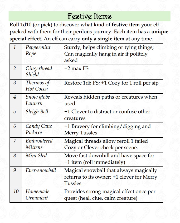Festive Quest RPG is a rule-lite tabletop RPG made in the OSR spirit. It's simple to pick up and play and provides you with all the tools to tell an amazing one-shot story of a group of elves going on a quest to fetch the most beautiful Christmas Tree in the world!